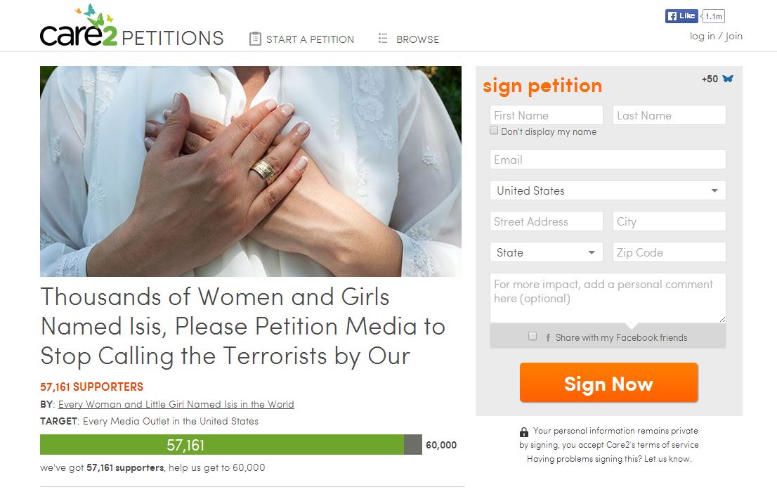 It appears that the Isises in the world have had it with the stigma associated with the name. An online petition has been started to urge the media not to use the acronym.