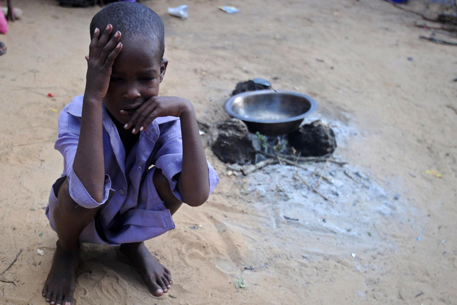 A displaced Somali child sitting at a makeshift camp in the Garasbaley area on the outskirts of the capital Mogadishu on May 24, 2017.