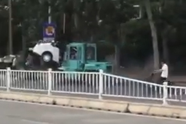 In a video posted on The Beijing News, the forklift is seen ramming into a car and carrying it as it continues crashing into more vehicles on the road.