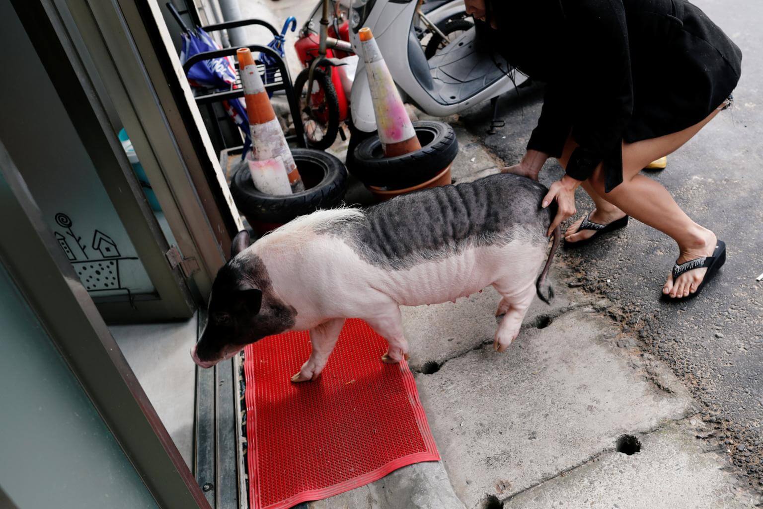 A pet pig walks into a vet clinic for health inspection, in Taoyuan, Taiwan, on Jan 29, 2019. Veterinarian Chang Chien-ming said only one in 100 vet clinics accept pig patients.