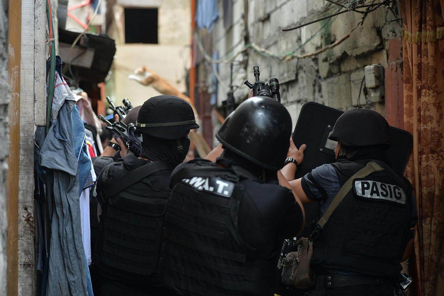 Philippine police SWAT personnel take position as they serve a search warrant to a resident in relation to drugs at an informal settler house in Pasig City, suburban Manila on Sept 5, 2016.