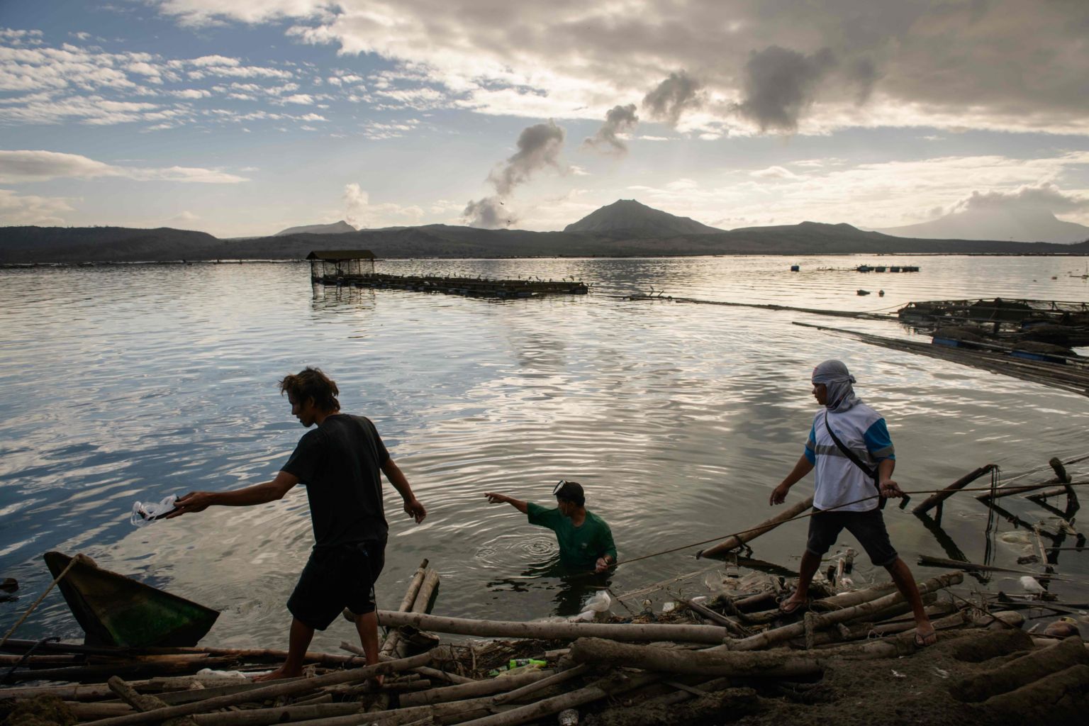 A group of fishermen make repairs to their operations affected by the ashfall from the eruption of the Taal volcano, in Buso Buso on Jan 20, 2020.