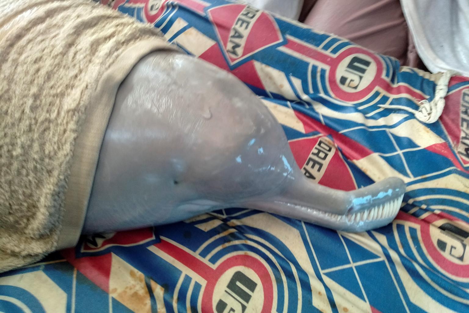 An Indus river dolphin is covered with a wet towel after it was rescued from a canal in Larkana, Pakistan, on Oct 29, 2021.