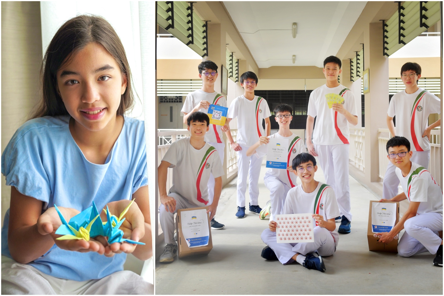 Naia Stromsoe (left) and her friends are folding 1,000 paper cranes to raise funds, while Bukit Panjang Government High School students did a fund raiser via the Red Cross.