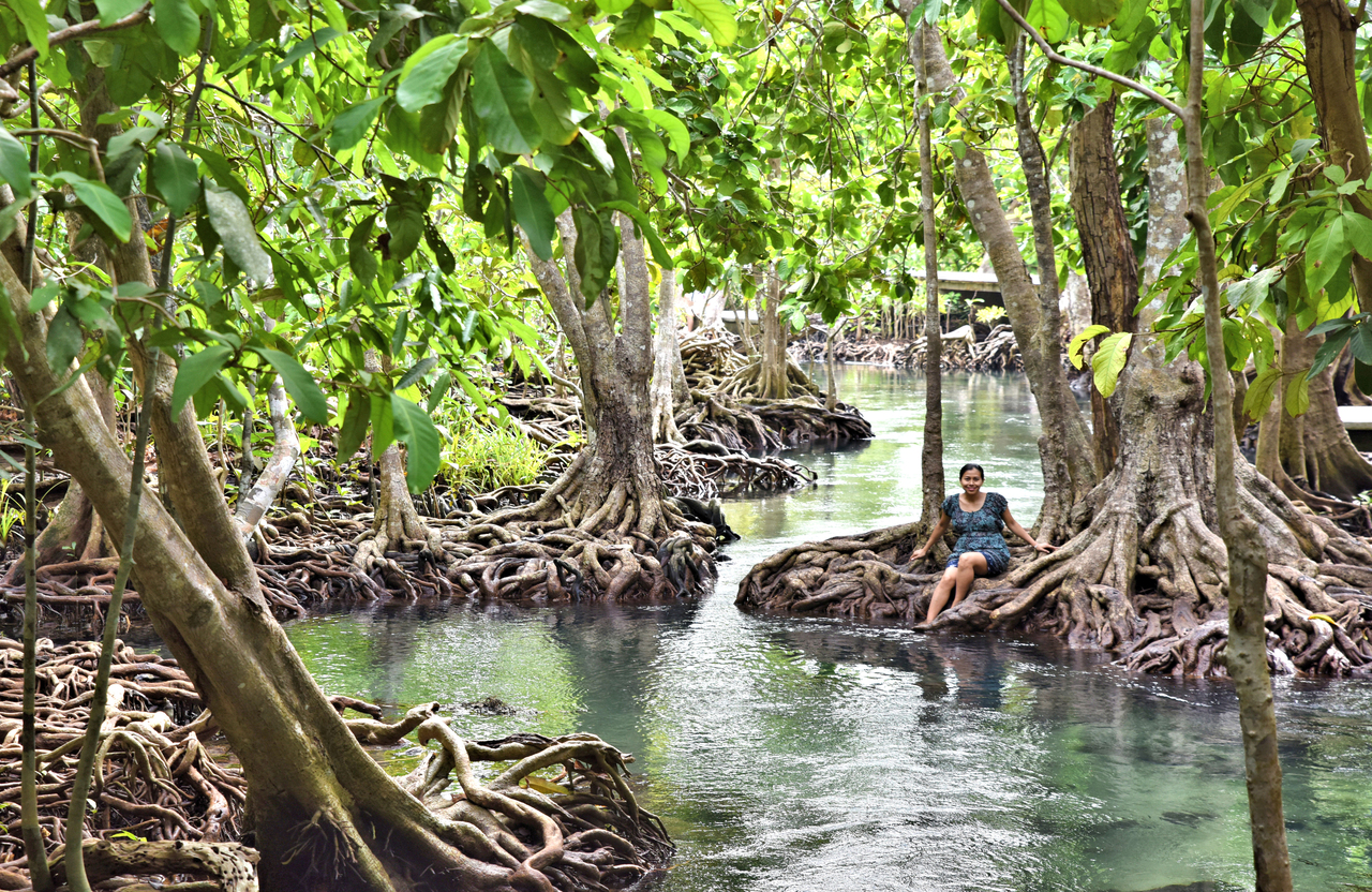 My wife has her feet dipped in turquoise water as she sits on a tree root system so intricate, it looks unreal.