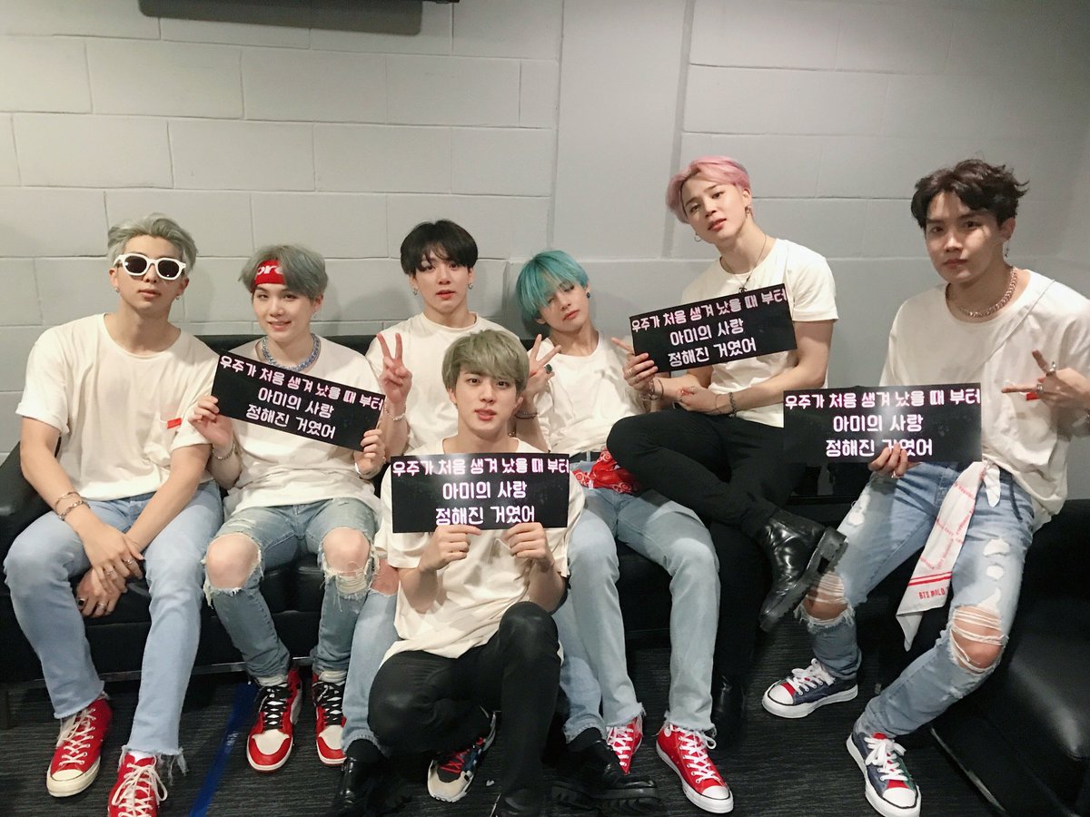 They tweeted two photos of the band holding up signs in Korean which read, "From the day the universe was born, Army's (referring to their fans) love was destined"; and one of the crowd at the stadium on Jan 19.