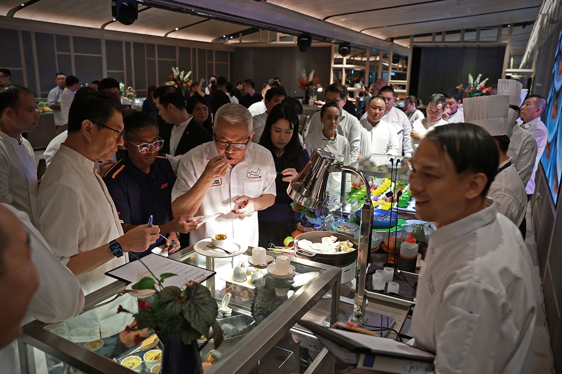 From left: Chef auditor Eric Teo, Singapore GP food and beverage director Siva Kanthan and chef consultant Martin Woo sampling an array of food during a final tasting session at ParkRoyal Collection Marina Bay on July 12.