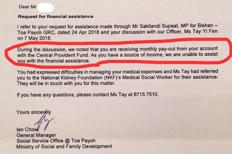 The letter said that the resident is receiving a monthly payout from his Central Provident Fund savings.