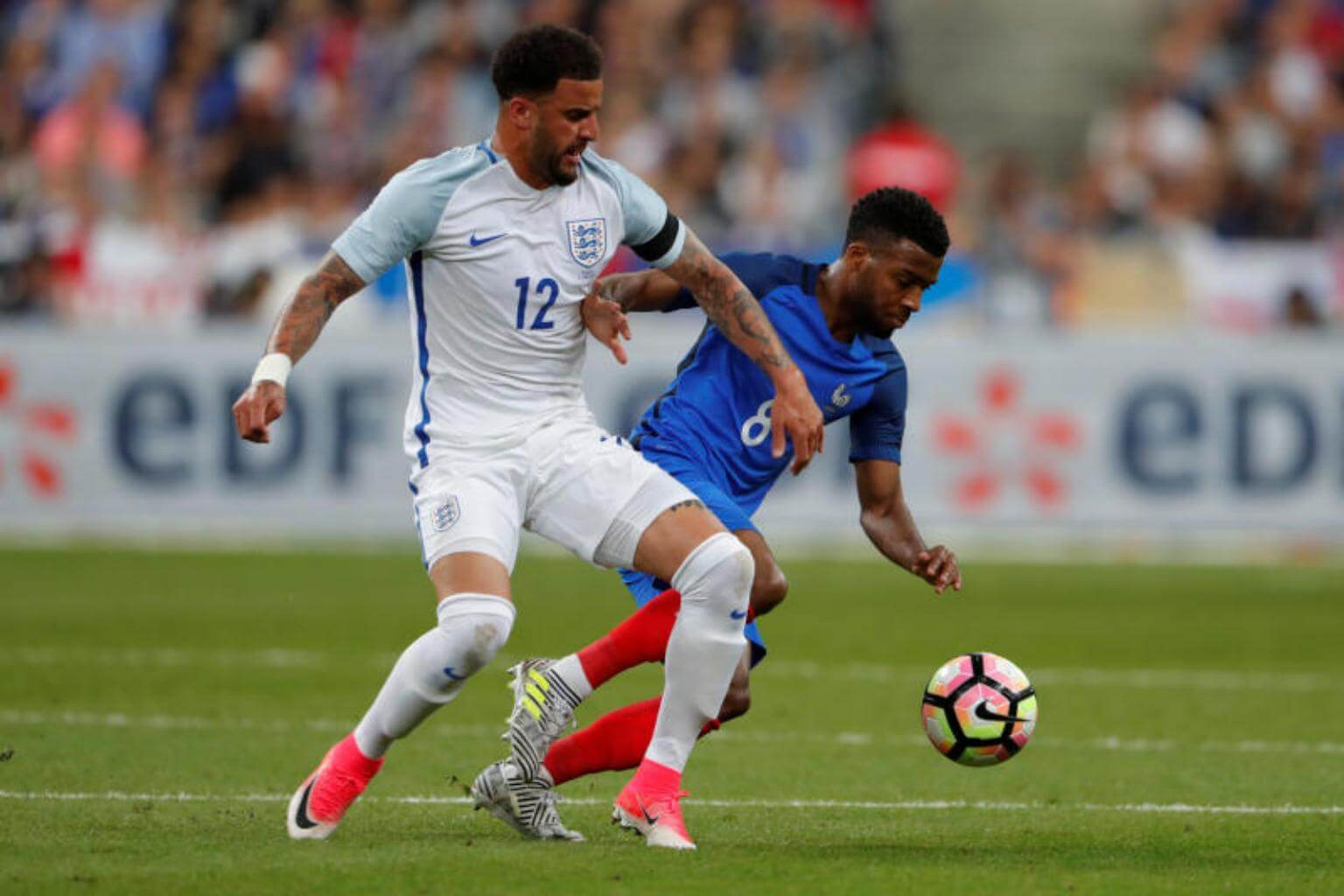 England's Kyle Walker in action with France's Thomas Lemar for a friendly match on June 13, 2017.