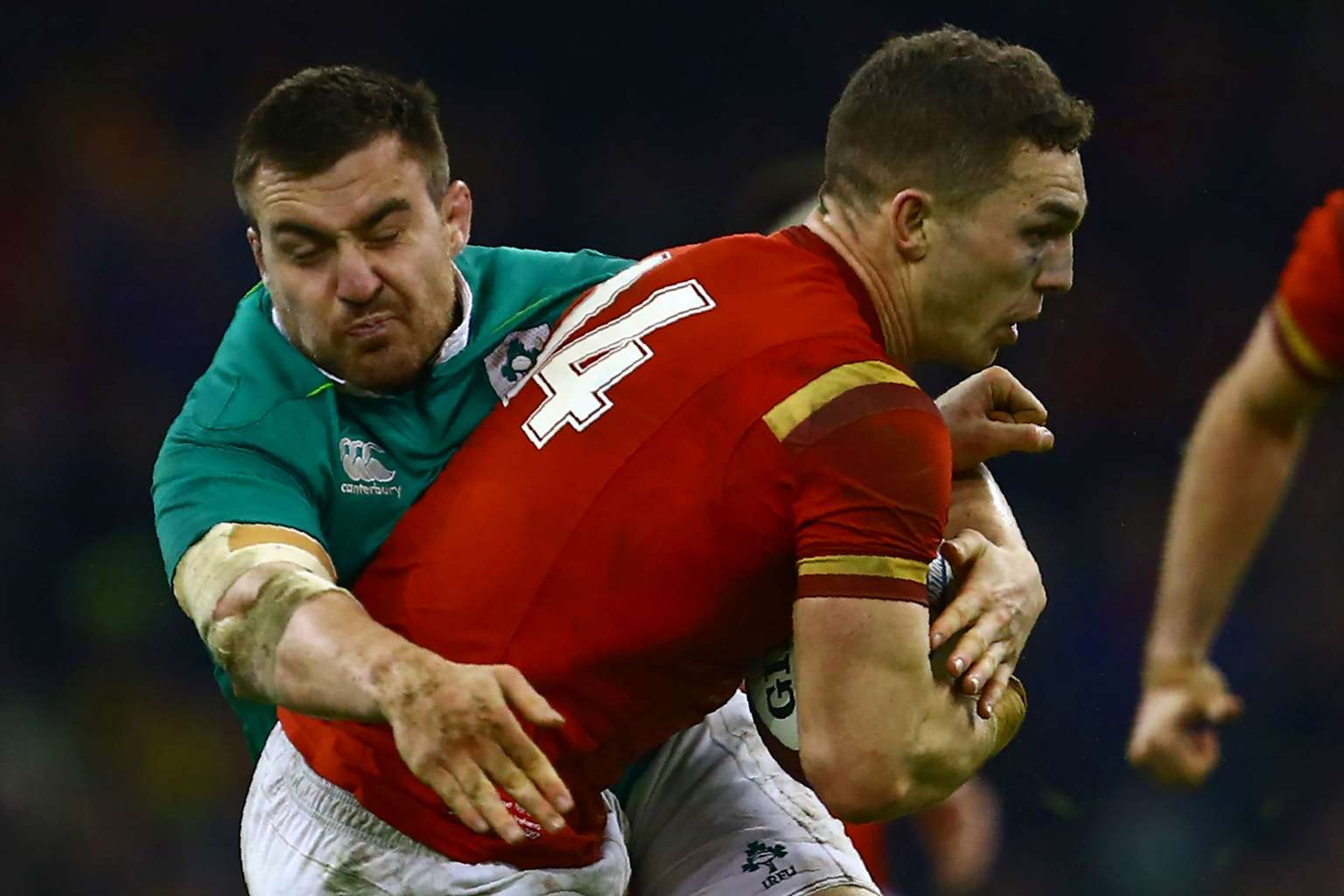 Wales' wing George North is tackled by Ireland's Niall Scannell (left) during the Six Nations international rugby union match between Wales and Ireland at the Principality Stadium in Cardiff, south Wales, on March 10, 2017.