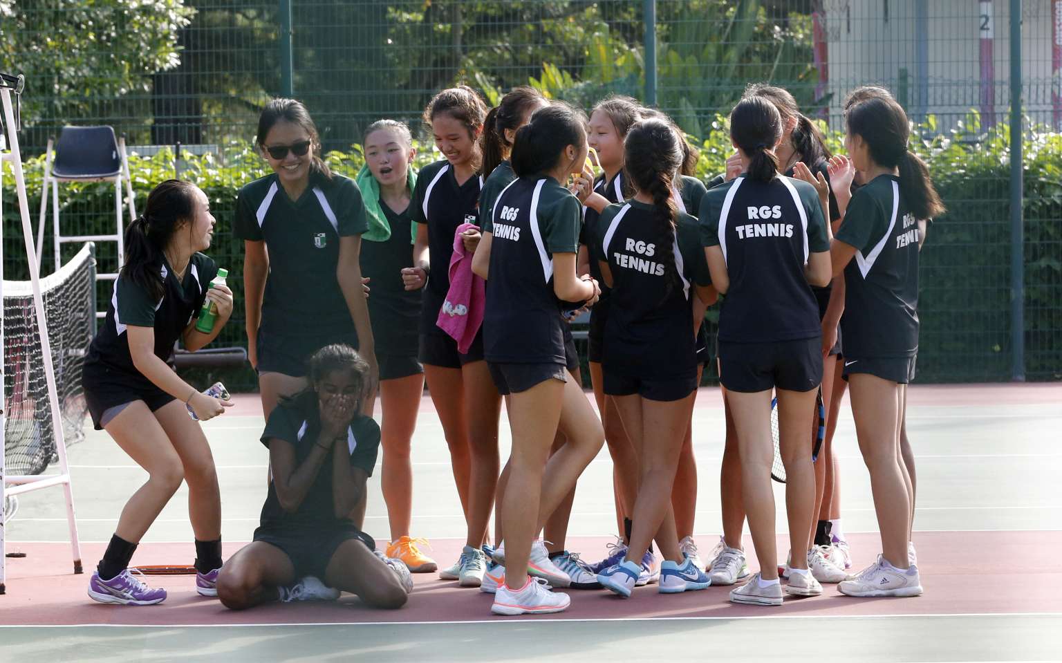 The girls' final was locked at 2-2, with RGS earning points in the singles through Tammy Tan, who beat Zhang Hanyu 6-1, 6-1, and Meg Ang, who beat Tamara Tan 6-2, 6-4.