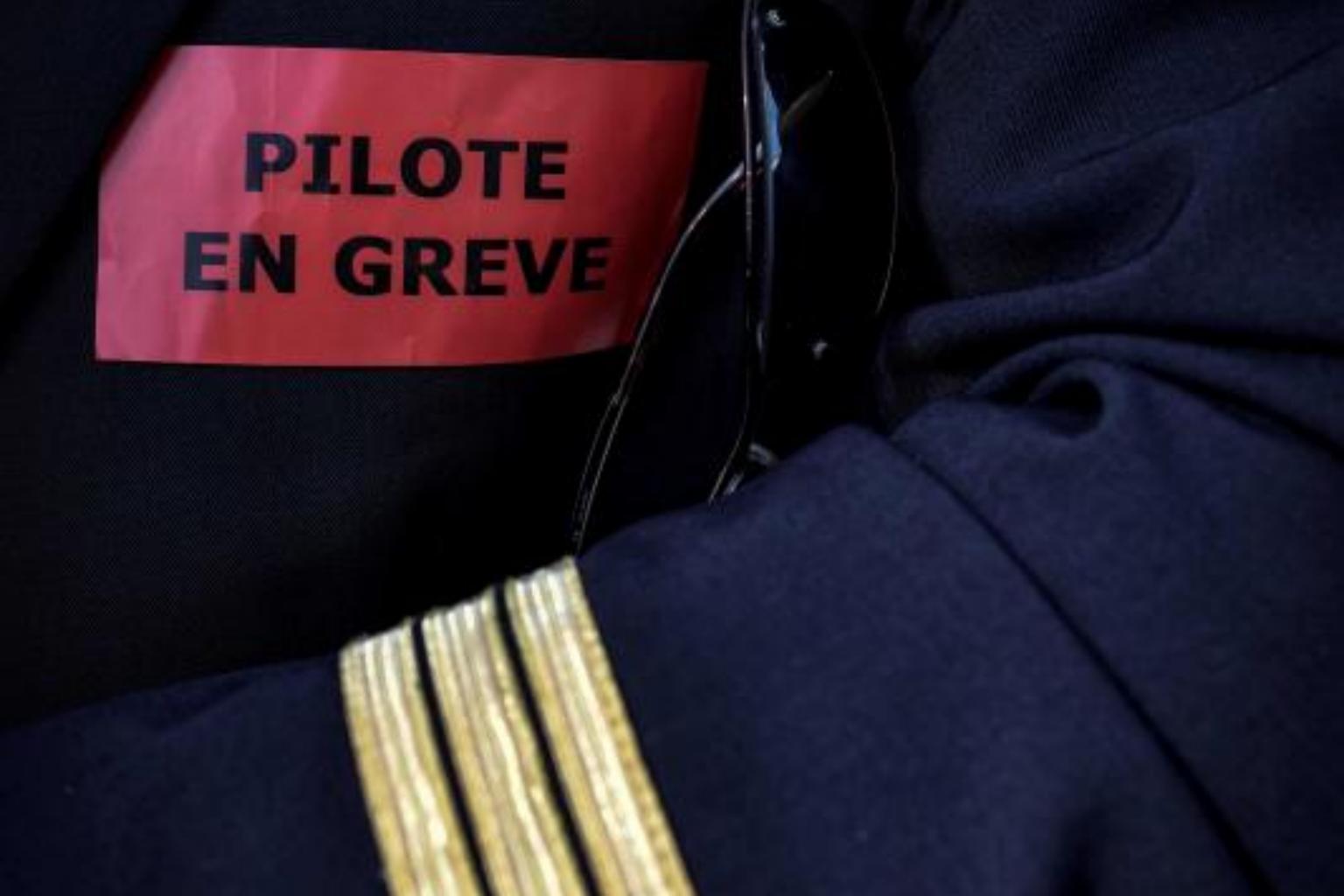 An Air France pilot wears a sticker reading in French "on strike pilot" on his uniform on April 24, 2018.