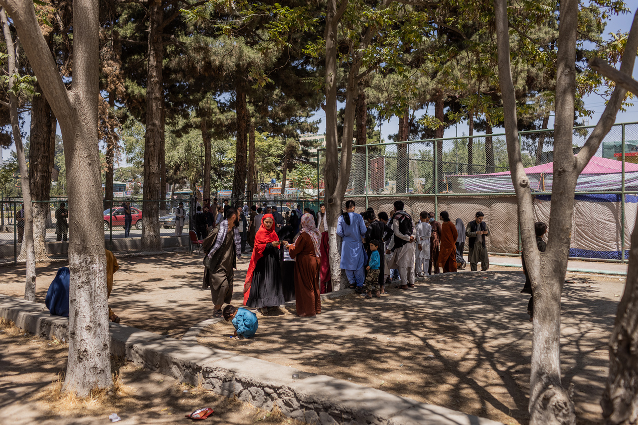 Families who fled fighting in northern Afghanistan at a park in Kabul, Afghanistan on Aug 9, 2021.