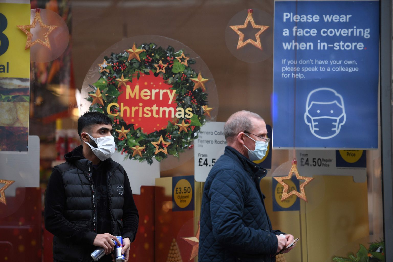 People walk past the window of a closed shop displaying Christmas decorations in the centre of Manchester, on Nov 26, 2020.