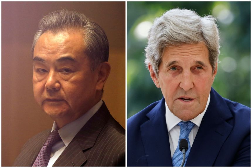Chinese State Councillor and Foreign Minister Wang Yi (left) addressed US climate envoy John Kerry via video link.