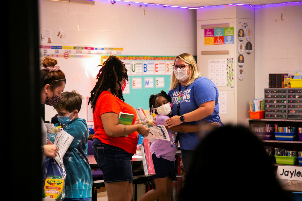 A teacher hugs her student as they attend orientation at Blue Lick Elementary School in Louisville, Kentucky on Aug 9, 2021.