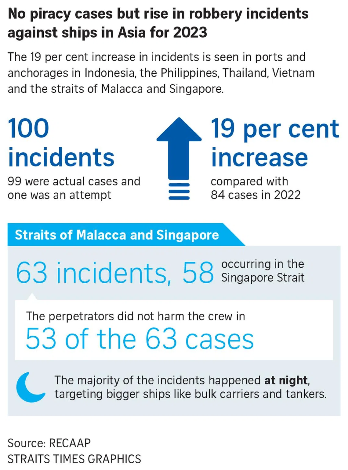 SINGAPORE - A total of 100 incidents of armed robbery against ships in Asia took place in 2023, a marked increase from the 84 such incidents in 2022.