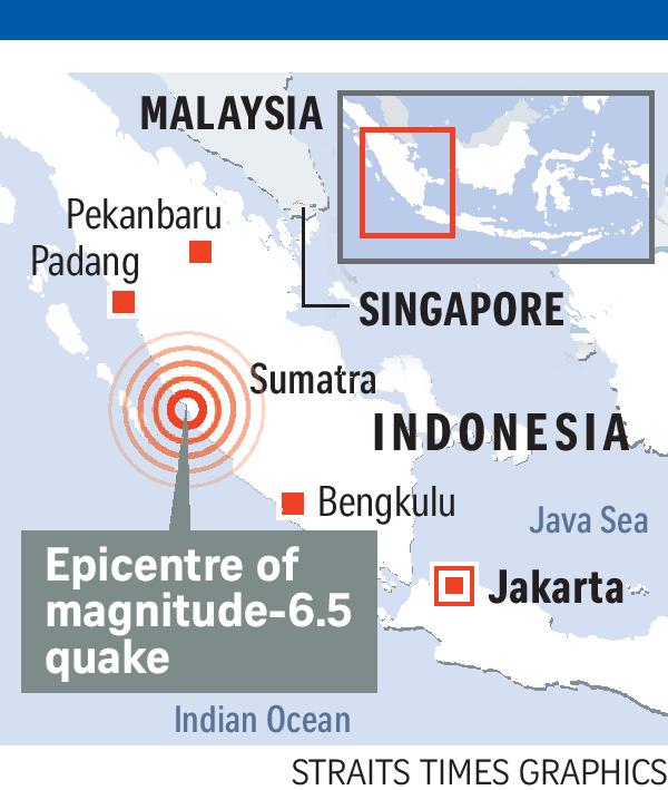 A magnitude-6.5 earthquake struck the Indonesian island of Sumatra yesterday, with tremors also felt in neighbouring Singapore.