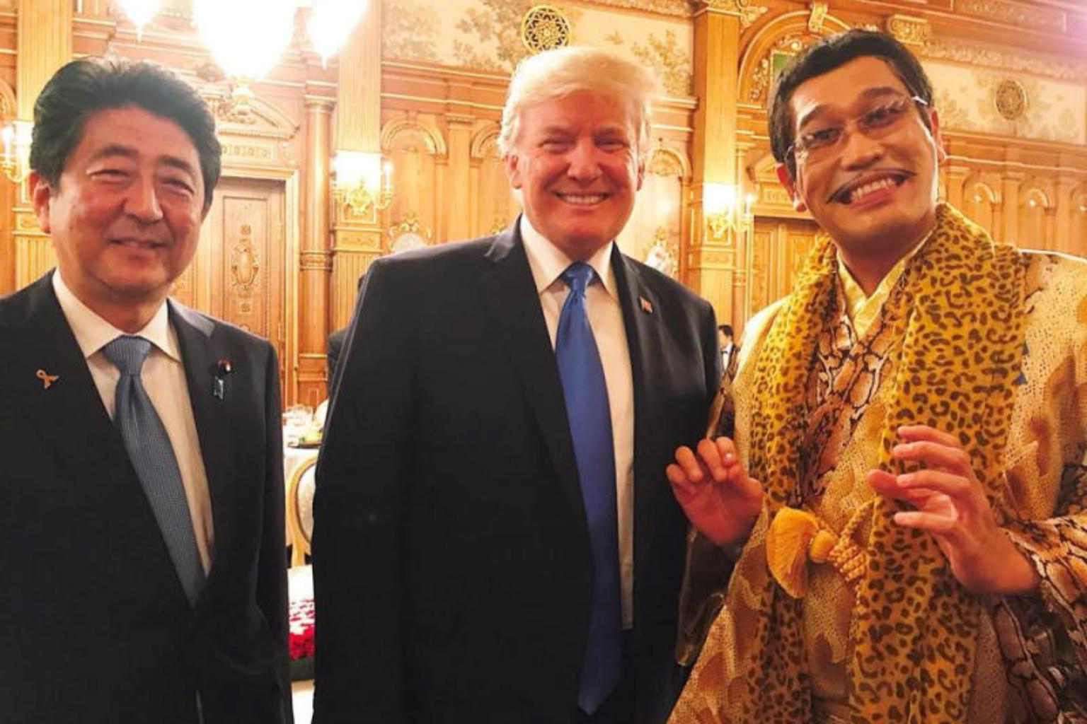 Japanese pop star Pikotaro (right) poses with Japan's Prime Minister Shinzo Abe and US President Donald Trump during an official dinner in Trumps honour at Akasaka Palace in Tokyo, Japan on Nov 6, 2017.