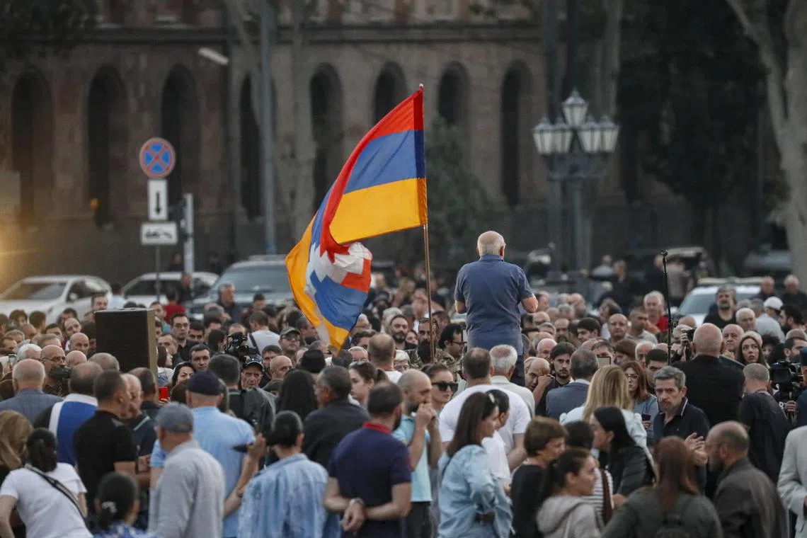 A Nagorno-Karabakh flag flies as Armenian anti-government demonstrators attend an opposition rally demanding the resignation of Prime Minister Nikol Pashinyan, in downtown Yerevan.