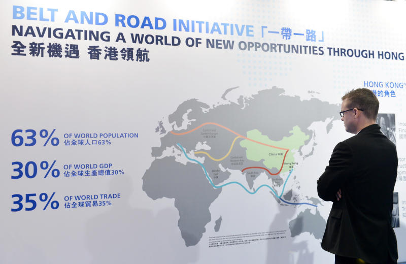 A visitor looking at the information board showing Hong Kong's participation in the Belt and Road Initiative.