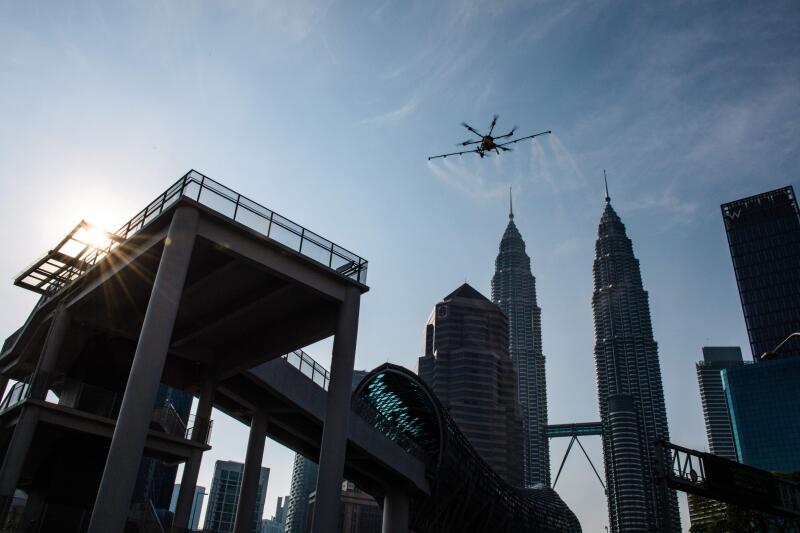 A drone sprays disinfectant in Kuala Lumpur, on March 31, 2020.