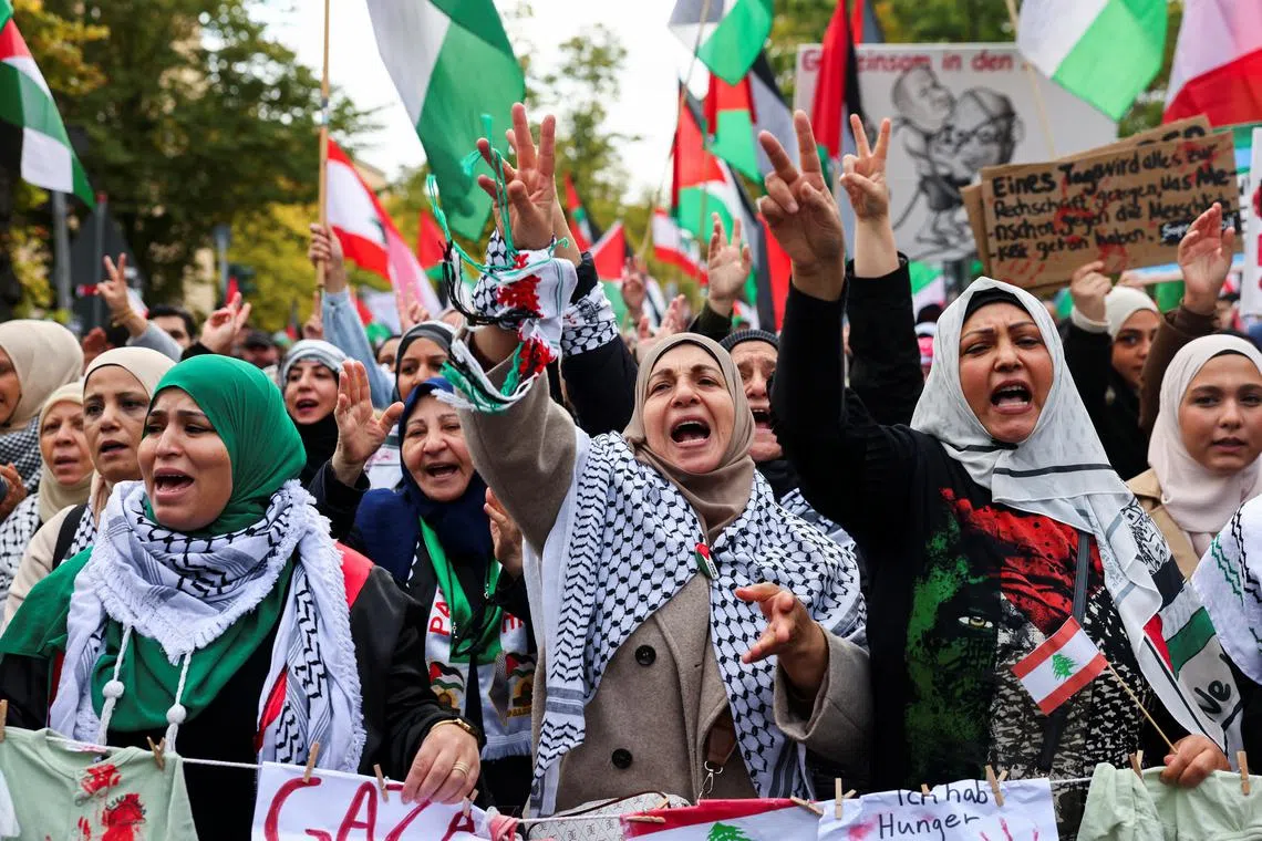 Protesters holding Lebanese and Palestinian flags while demonstrating in Berlin, Germany, on Oct 5, in solidarity with Palestinians in Gaza.