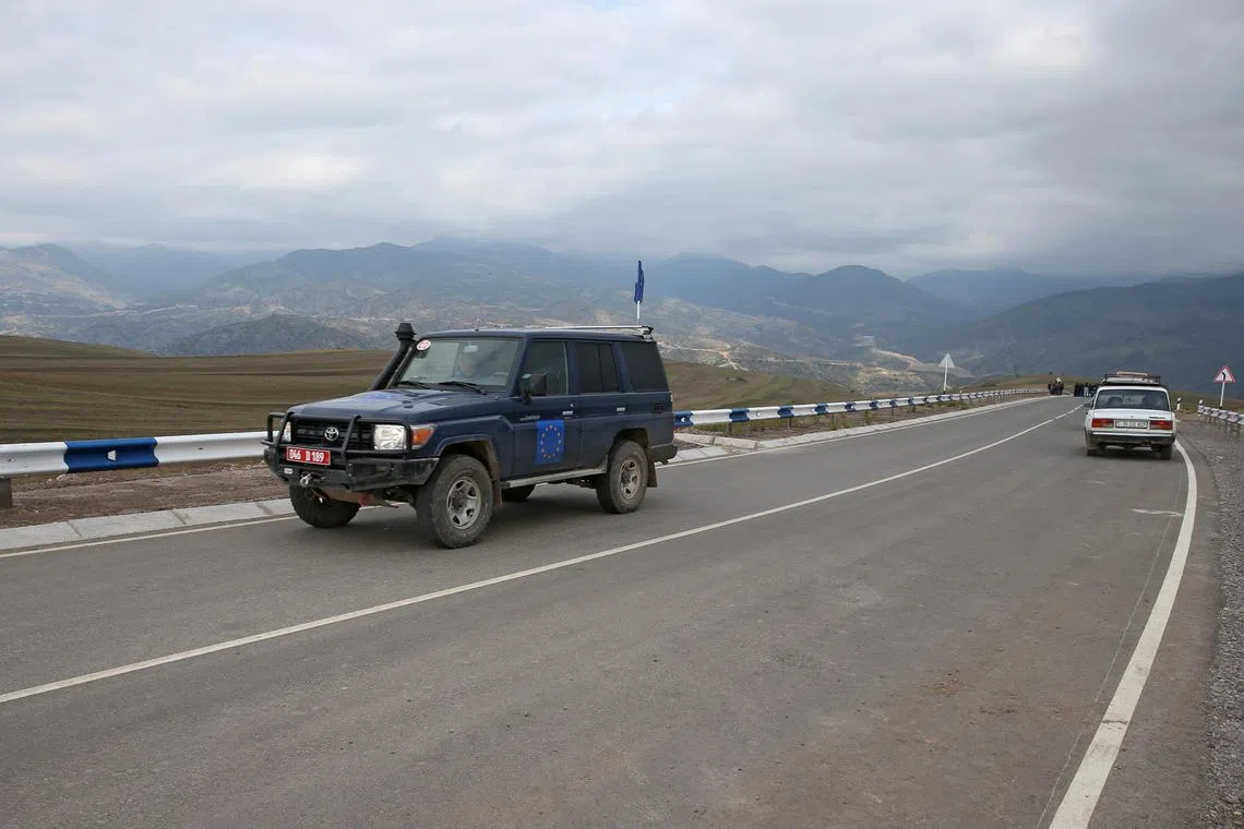 EU observers drive on the road leading from Armenia to Azerbaijan’s Nagorno-Karabakh region.