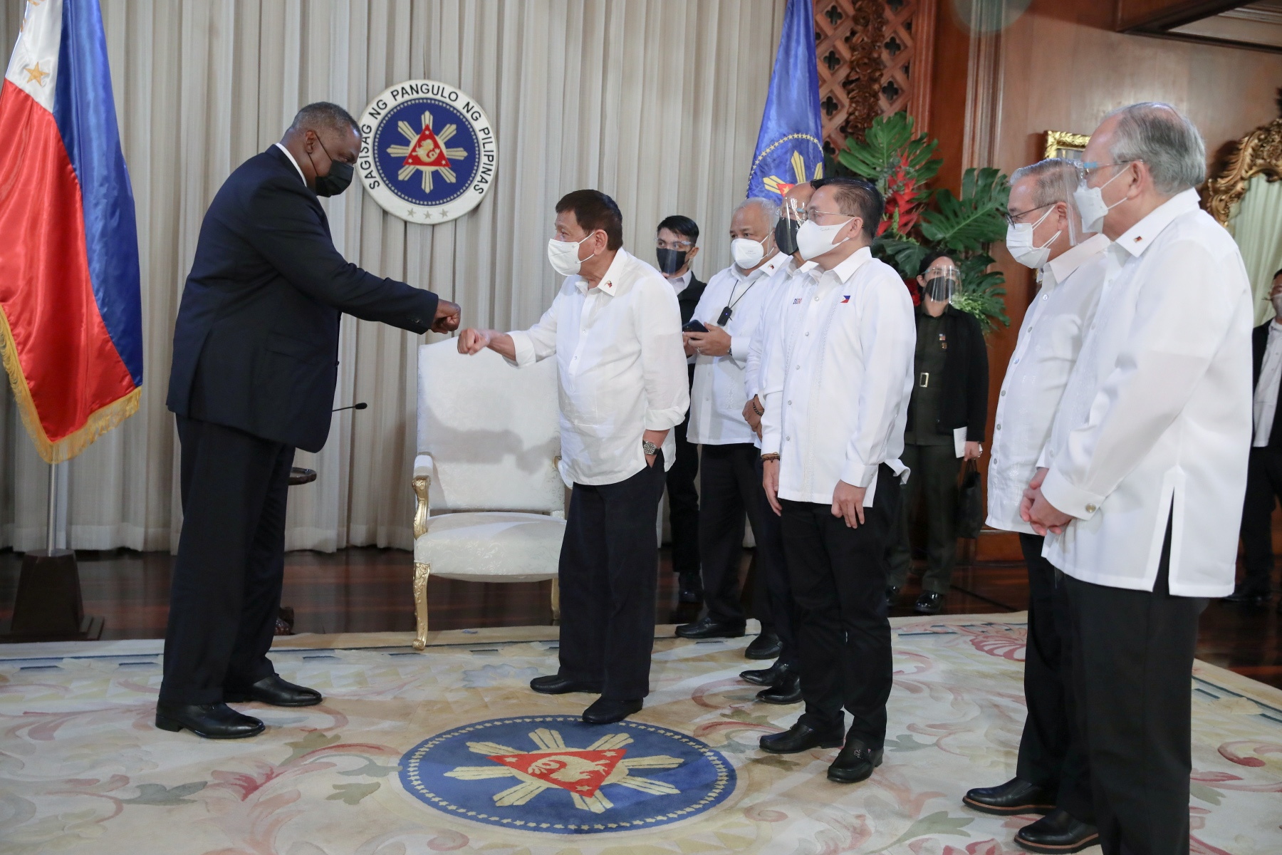 <p>U.S. Secretary of Defense Lloyd Austin fist bumps with Philippine President Rodrigo Duterte during a courtesy call at the Malacanang Palace in Manila, Philippines July 29, 2021. Robinson Ninal/Malacanang Presidential Photographers Division/Handout via REUTERS THIS IMAGE HAS BEEN SUPPLIED BY A THIRD PARTY. NO RESALES. NO ARCHIVES</p>