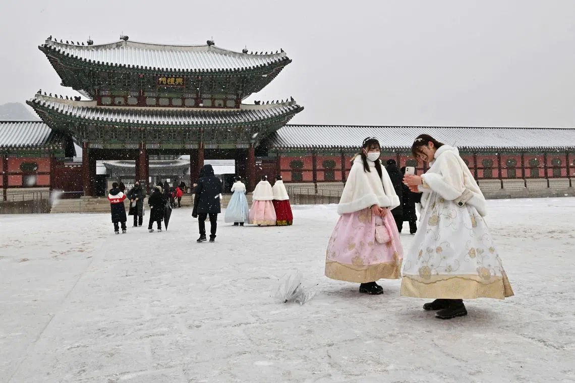 Visitors at the Gyeongbokgung Palace in Seoul during snowfall on Jan 26.