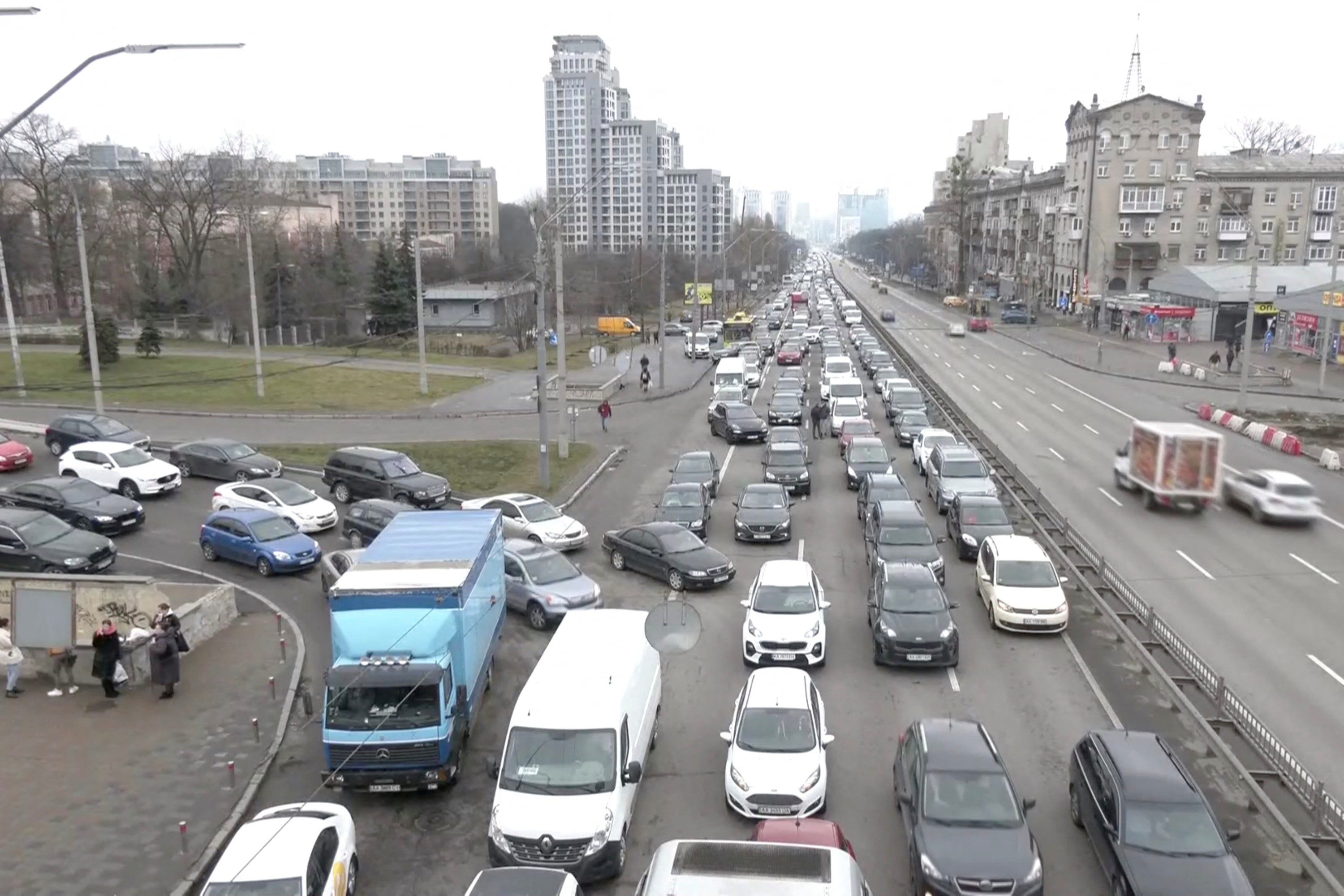 Heavy traffic on a road heading out of the Ukrainian capital Kyiv on Feb 24, 2022.