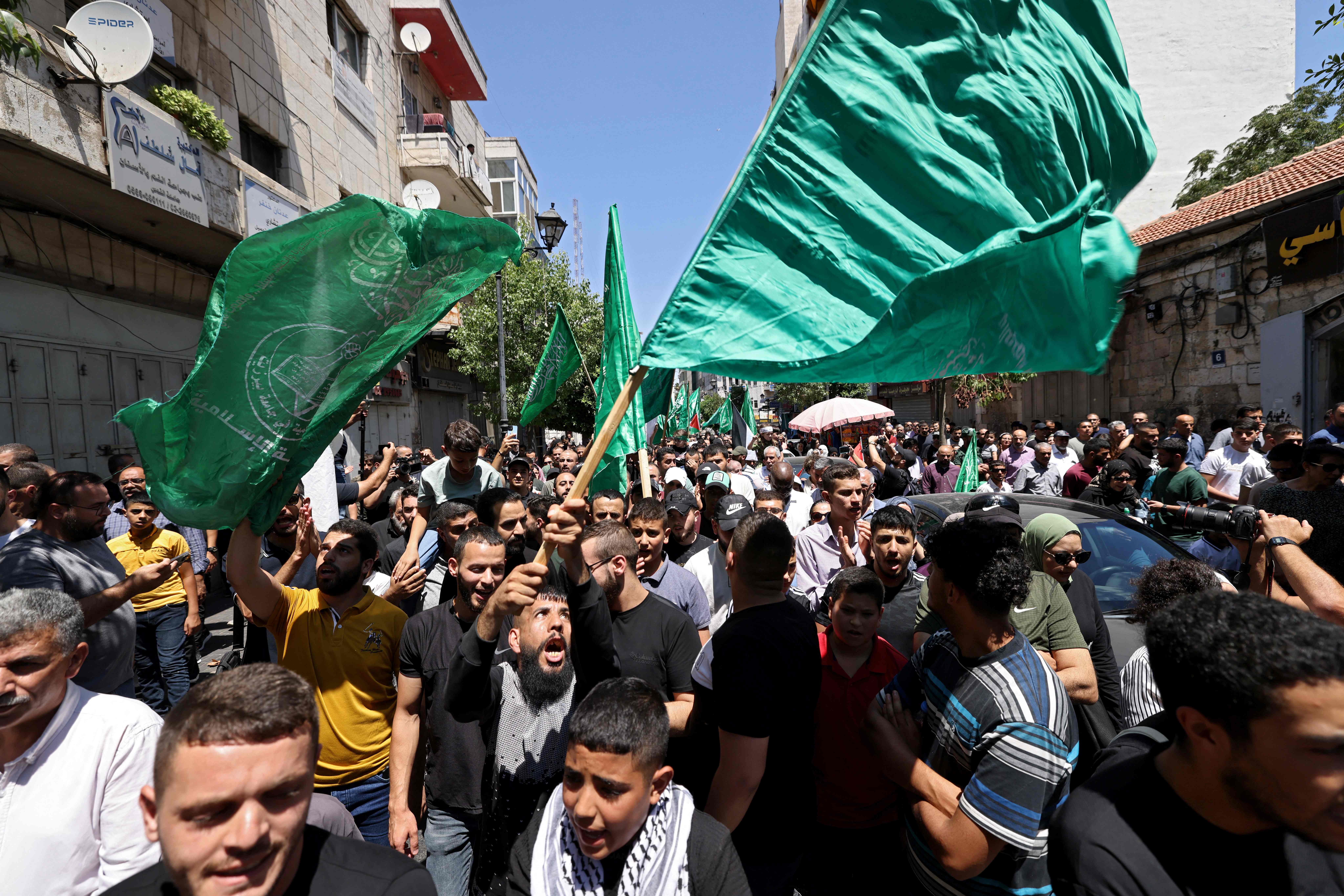 Palestinians shout slogans during a protest in the streets of the Israeli-occupied West Bank city of Ramallah.