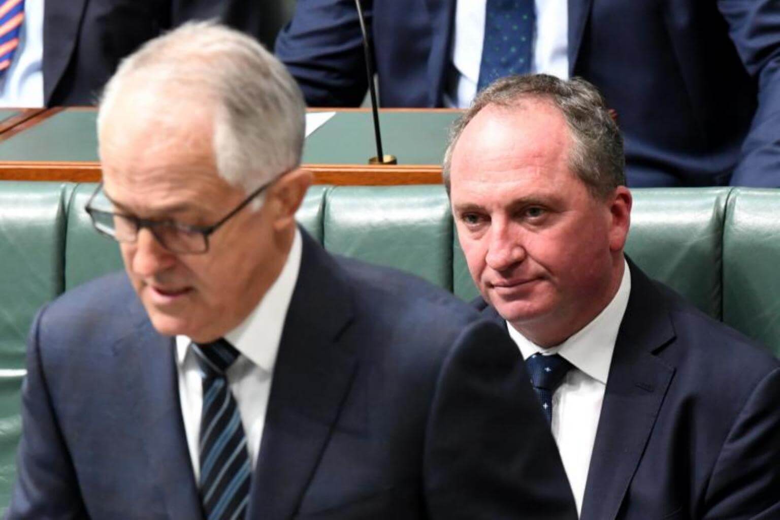 Australian Deputy Prime Minister Barnaby Joyce reacts in the House of Representatives as Australian Prime Minister Malcolm Turnbull (left, foreground) speaks at Parliament House in Canberra, Australian Capital Territory, Australia on August 14, 2017.