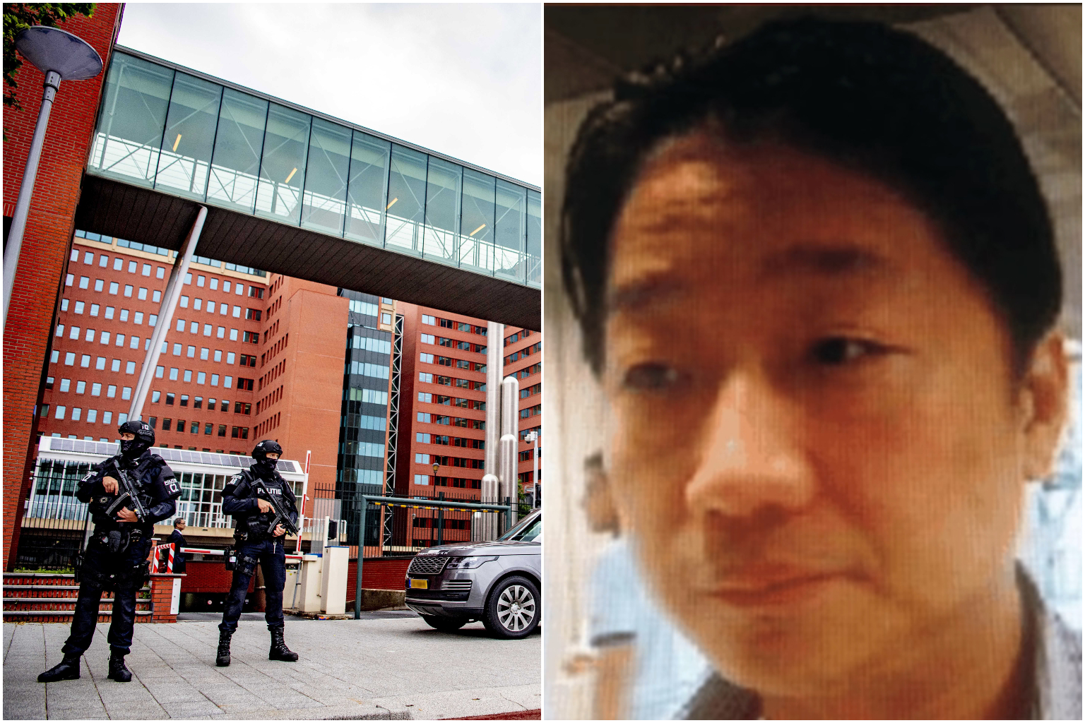 Police stand guard at a court in Rotterdam, The Netherlands, prior to the hearing on the extradition of Tse Chi Lop (right), on June 22, 2021.