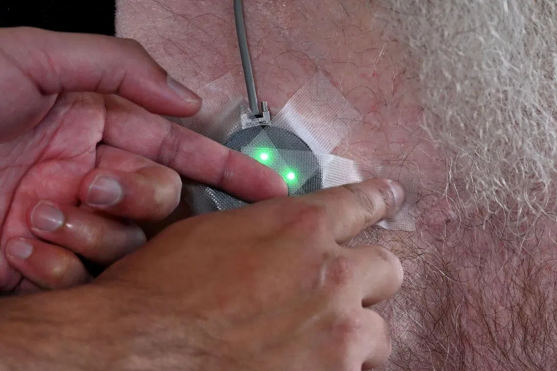 Synchron engineer Zafar Faraz securing an interface device that connects to a receiver and transmitter unit under the skin in Mr Rodney Gorham’s chest area.