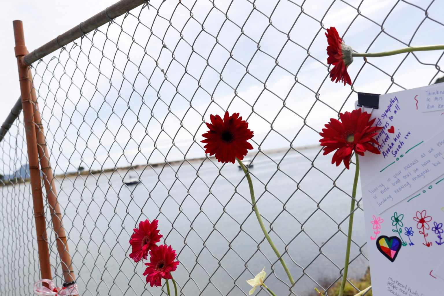 Flowers are seen at a memorial at the harbour in Whakatane, following the White Island volcano eruption in New Zealand, on Dec 11, 2019.