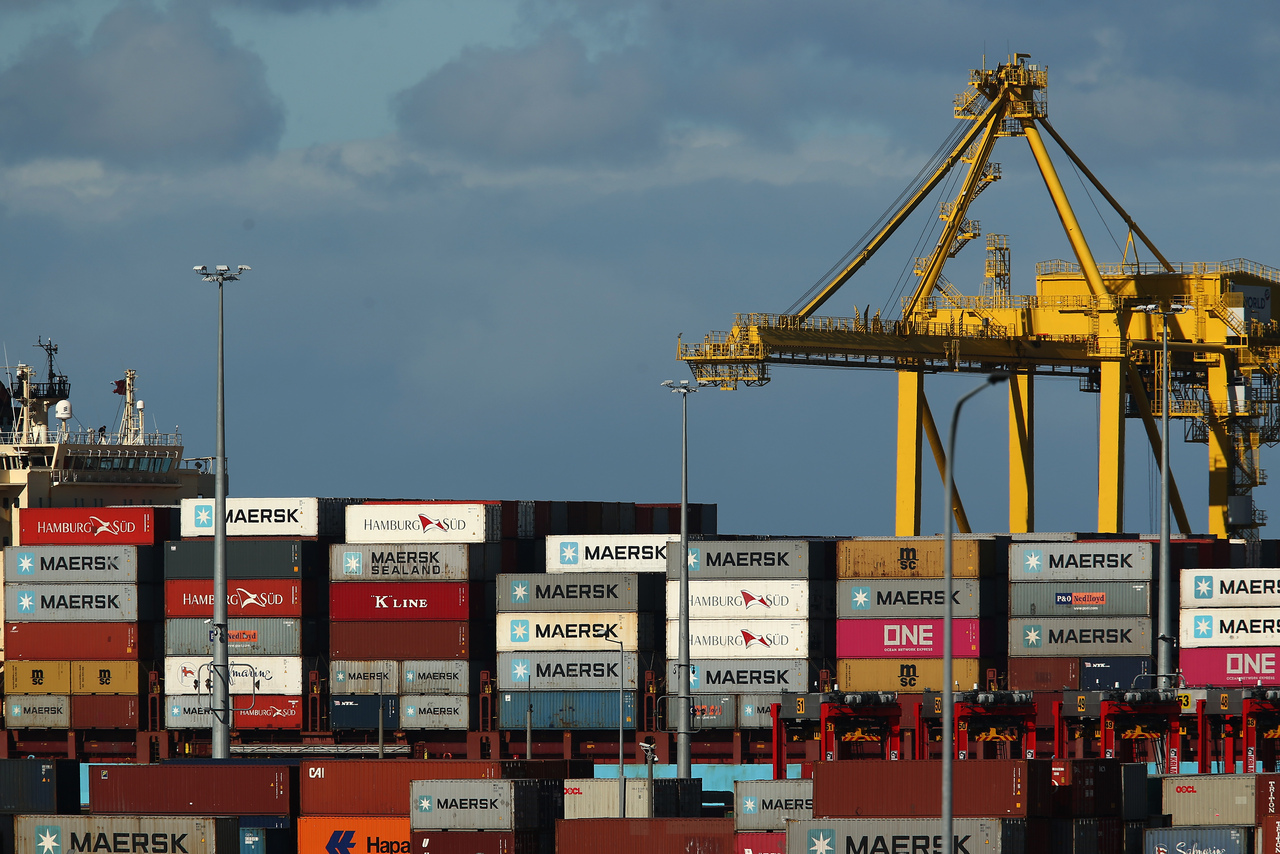 Shipping containers sit next to a crane at the Port Botany container terminal in Sydney on June 3, 2020.
