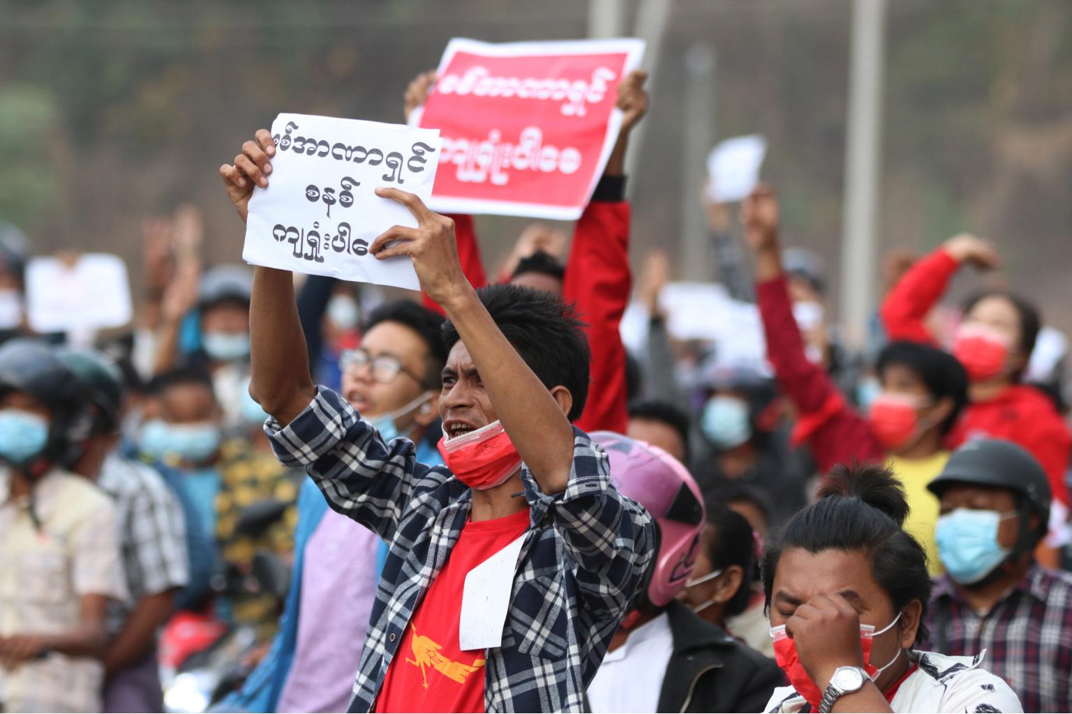 Demonstrators hold signs reading ''Down with Military Dictatorship'' during a protest against the military coup in Naypyidaw, Myanmar, on Feb 7, 2021.