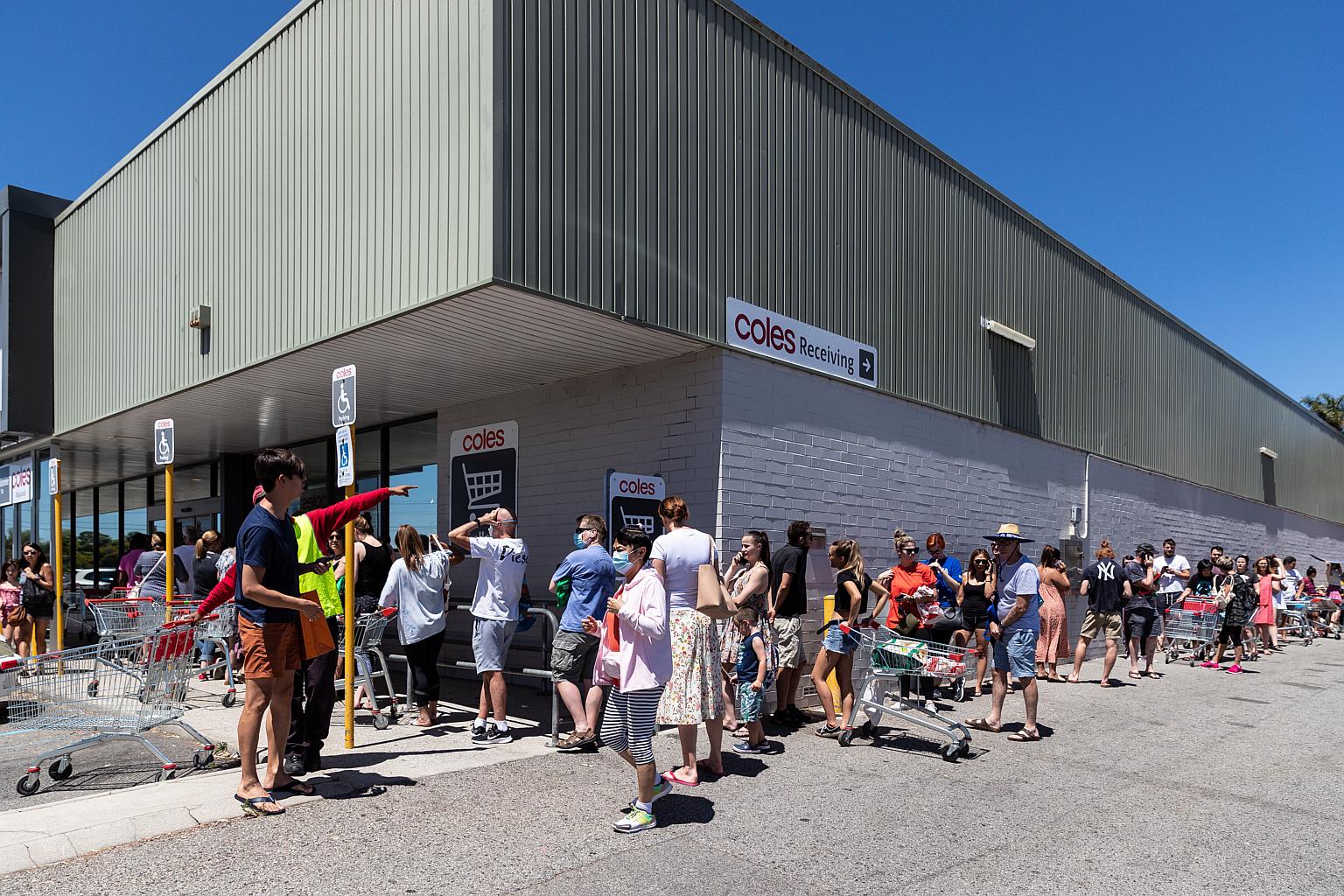 People queueing outside a supermarket in Perth, Australia, on Jan 31, 2021. The city was ordered into lockdown after a security guard at a hotel quarantine tested positive for Covid-19.