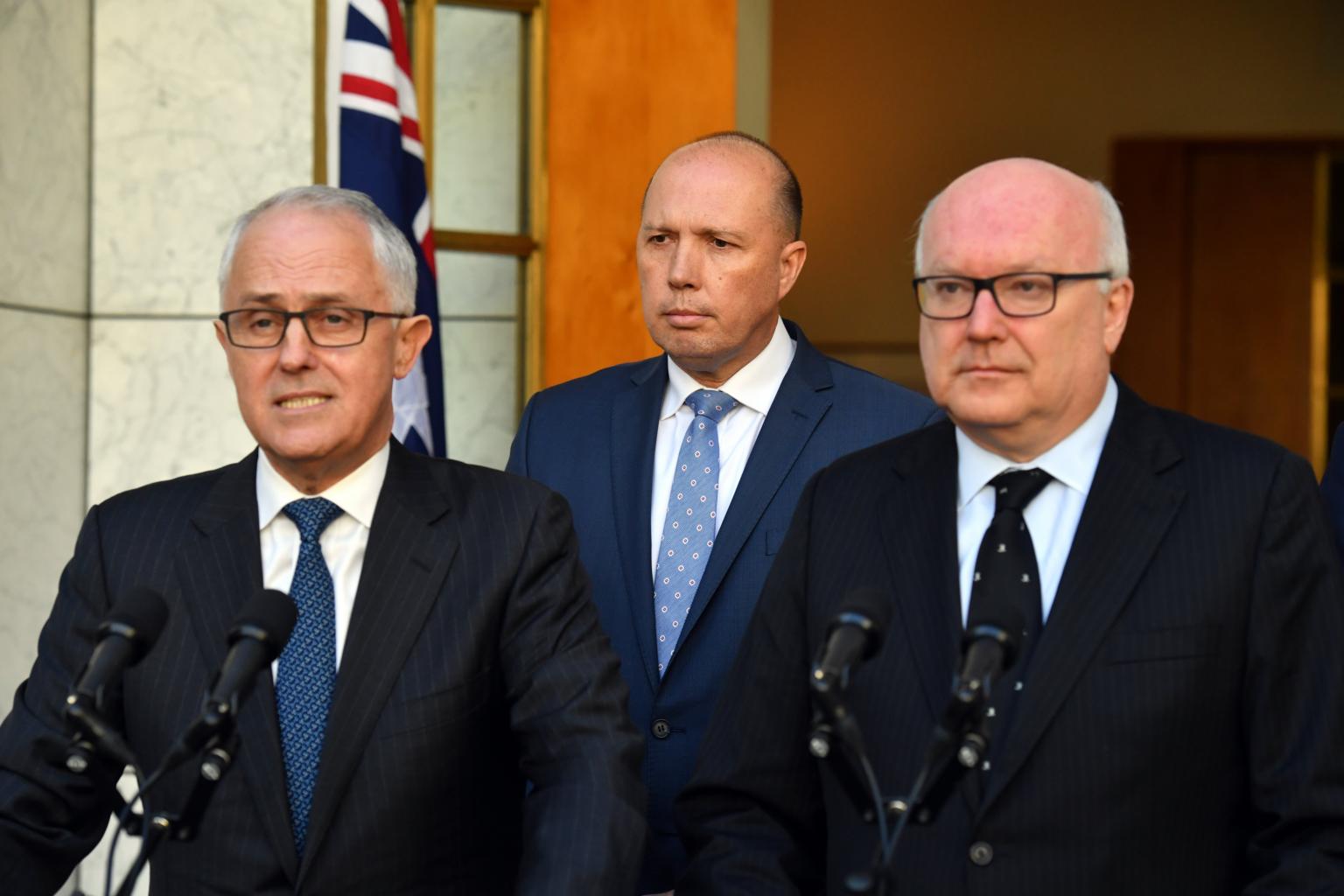From left: Australia's PM Malcolm Turnbull, Minister for Immigration Peter Dutton and Attorney-General George Brandis announcing a new home affairs department at a press conference at Parliament House in Canberra, on July 18, 2017.