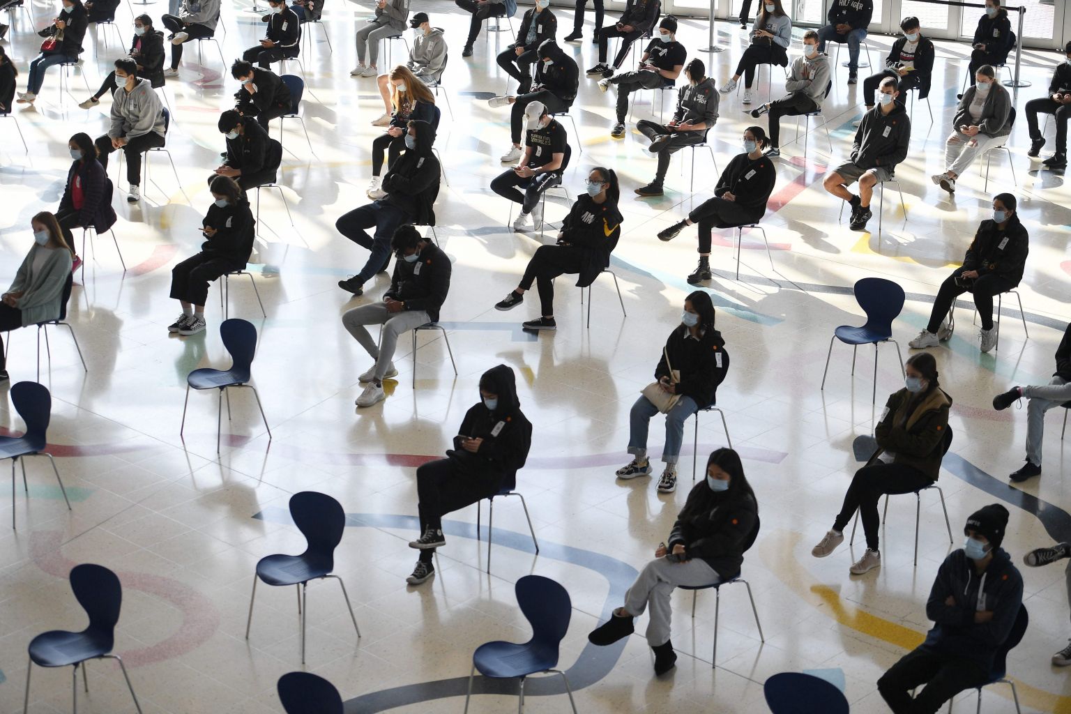 Students wait for their turn to receive their first dose of the Pfizer Covid-19 vaccine in Sydney, on Aug 9, 2021.