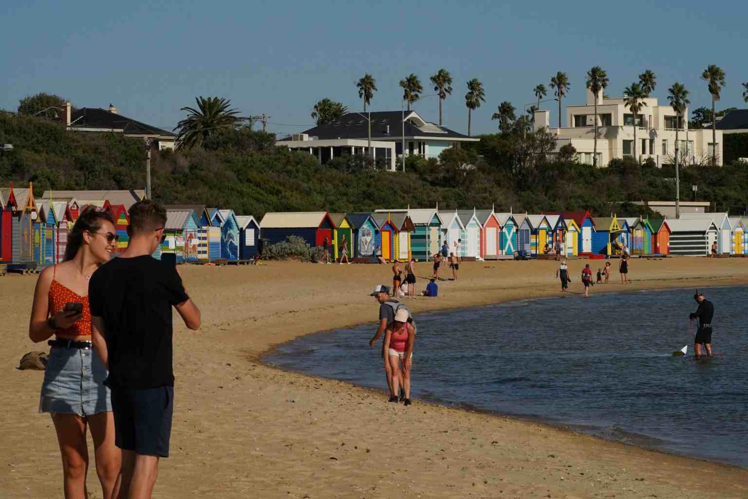 People walking on Brighton Beach in Melbourne, Australia, on March 28, 2020.