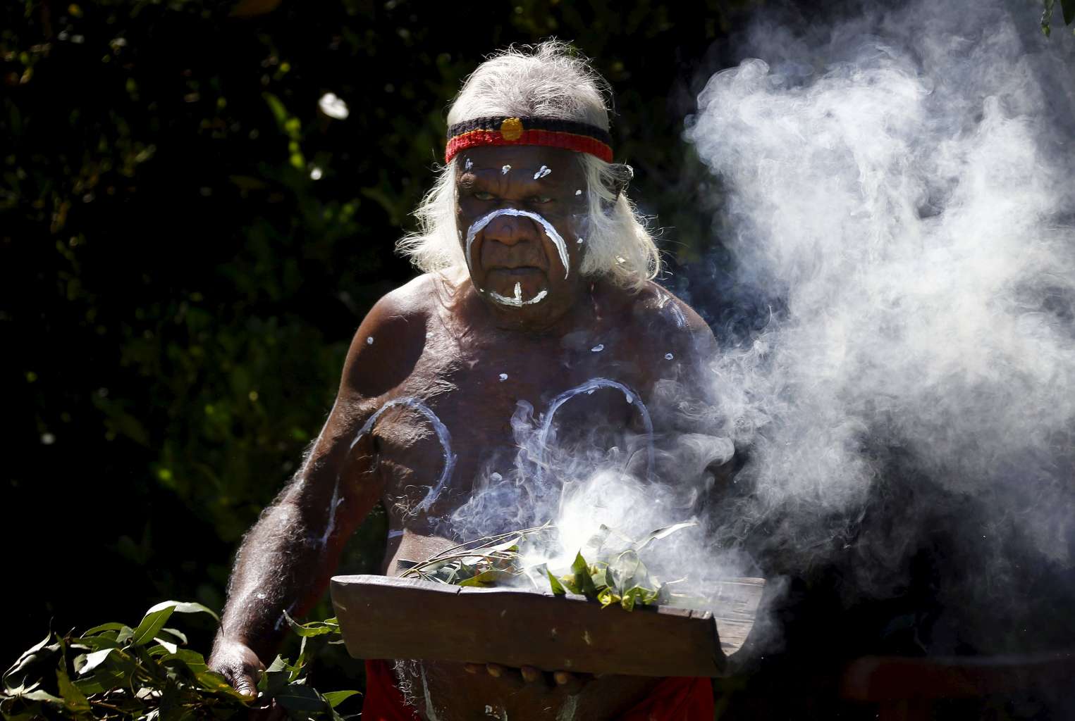 Aboriginal elder Max Eulo performs a smoking ceremony on the foreshore of Sydney Harbour on Nov 27, 2013.