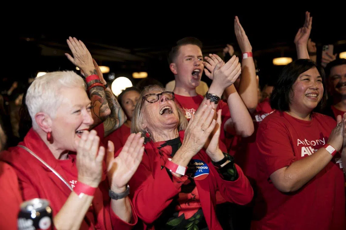 Supporters react during the Australian Labor Party election night event in Sydney, on May 3.
