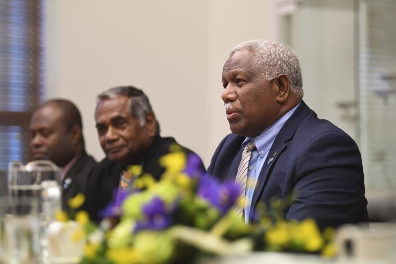 Prime Minister of the Solomon Islands Rick Houenipwela (right) speaks to Australian Prime Minister Malcolm Turnbull (not pictured) during a bilateral meeting at Parliament House in Canberra on June 13, 2018.