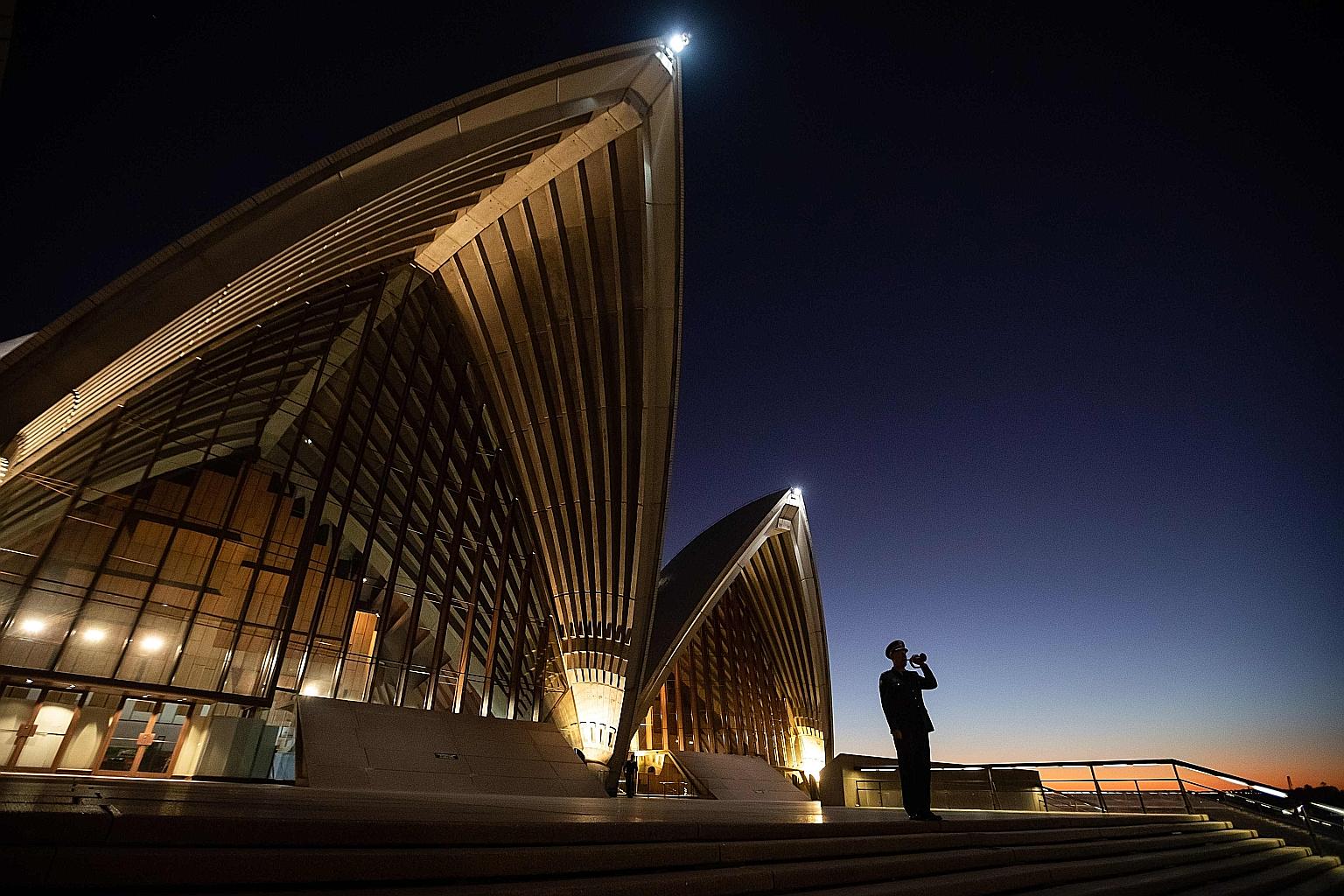 A lone bugler playing The Last Post on the steps of the Sydney Opera House yesterday, as Australians and New Zealanders held Anzac Day vigils at dawn from the isolation of their own driveways to honour their armed forces.