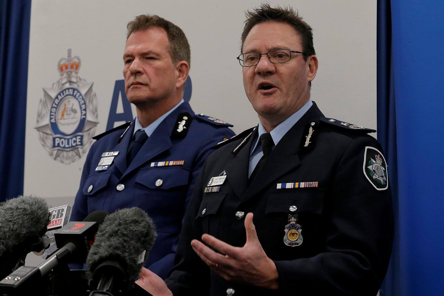Australian Federal Police Deputy Commissioner Michael Phelan (right) and New South Wales Police Deputy Commissioner David Hudson speak at a press conference at the Australian Federal Police (AFP) headquarters in Sydney, on Aug 4, 2017.