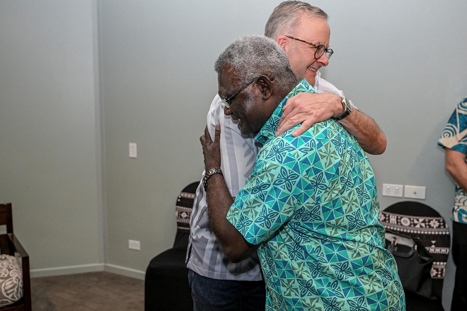 As Mr Albanese held out his arm for a handshake, Mr Sogavare cried “I need a hug”. The pair warmly embraced, apparently putting aside Mr Sogavare’s recent suggestion that the relationship had “soured”.