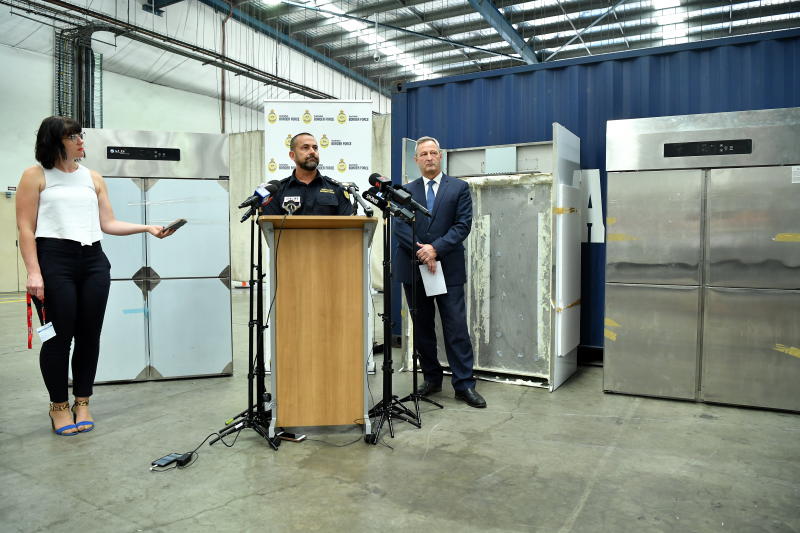 Australian Border Force Superintendent Garry Low (centre) and Organised Crime Squad Detective Assistant Superintendent Damian Beaufils with the fridges used to conceal methylamphetamine during a press conference in Sydney on April 8, 2019.