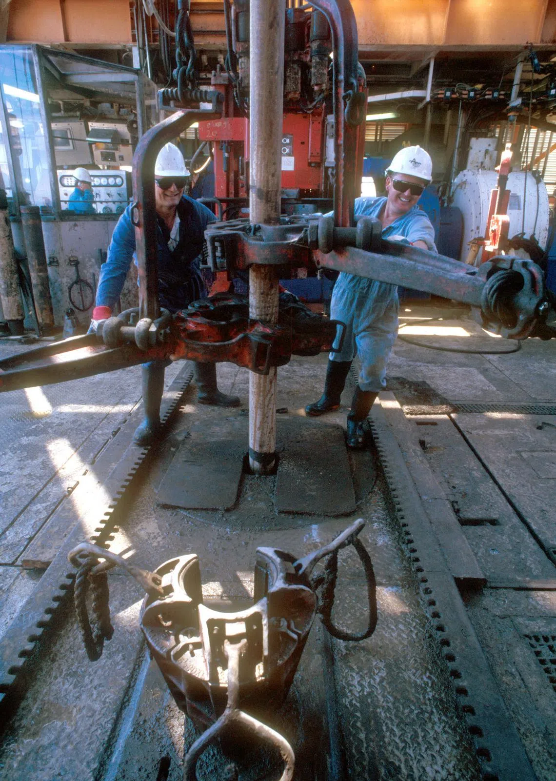 Roughnecks putting drill bits in place while drilling for gas on an offshore rig off the north-west shelf of Western Australia.